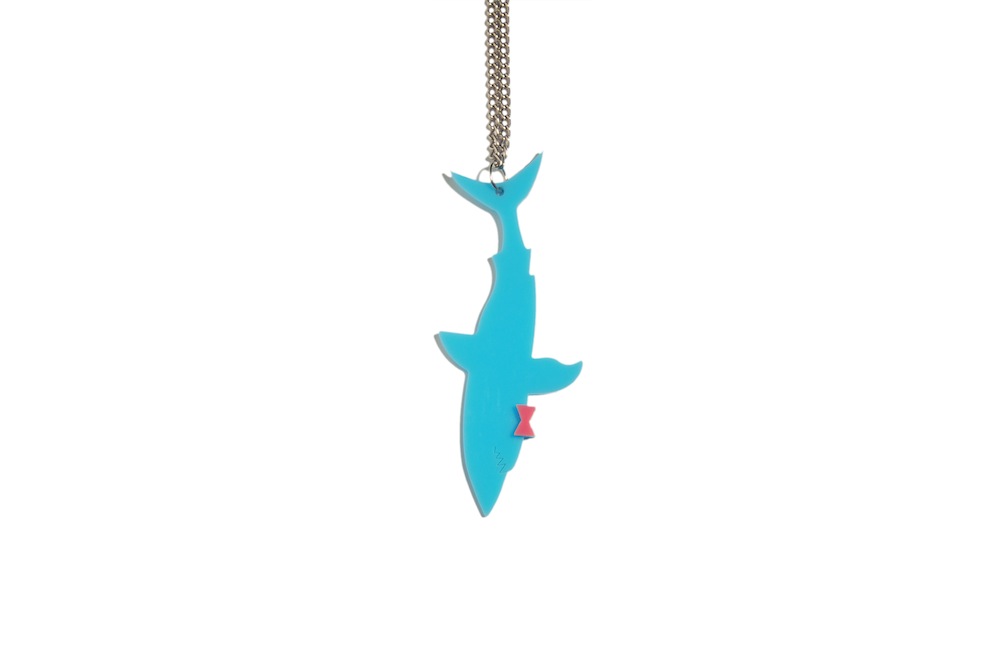 a M size Mr. SHARK plexiglass pendant with bow, on a silver colored metal chain