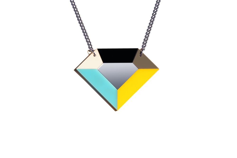 A M size lasercut mirror + multicolour plexiglass TOTEM pendant on a silver coloured metal chain.