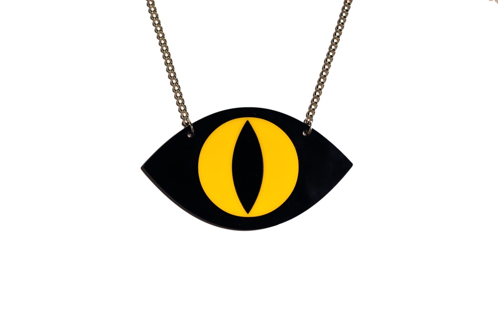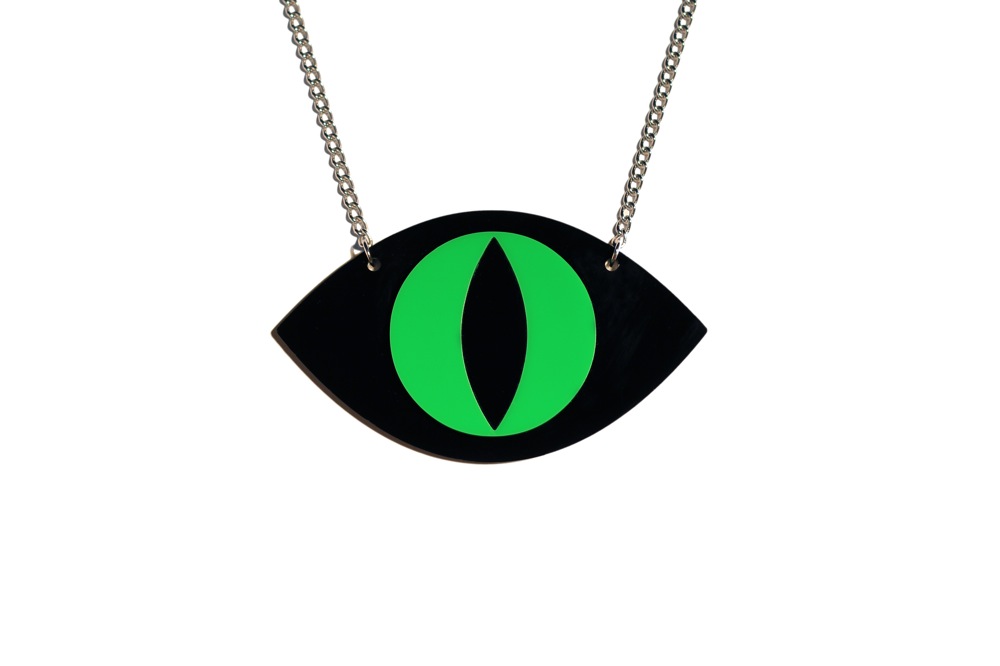 A M/L size lasercut plexiglass CAT EYE pendant on a silver coloured metal chain. Available in 3 colors