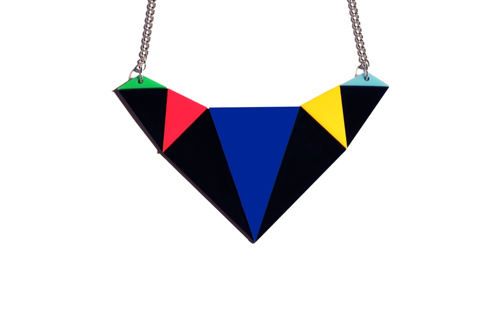 A L size lasercut black+multicolor plexiglass Disco Princess pendant on a silver coloured metal chain.