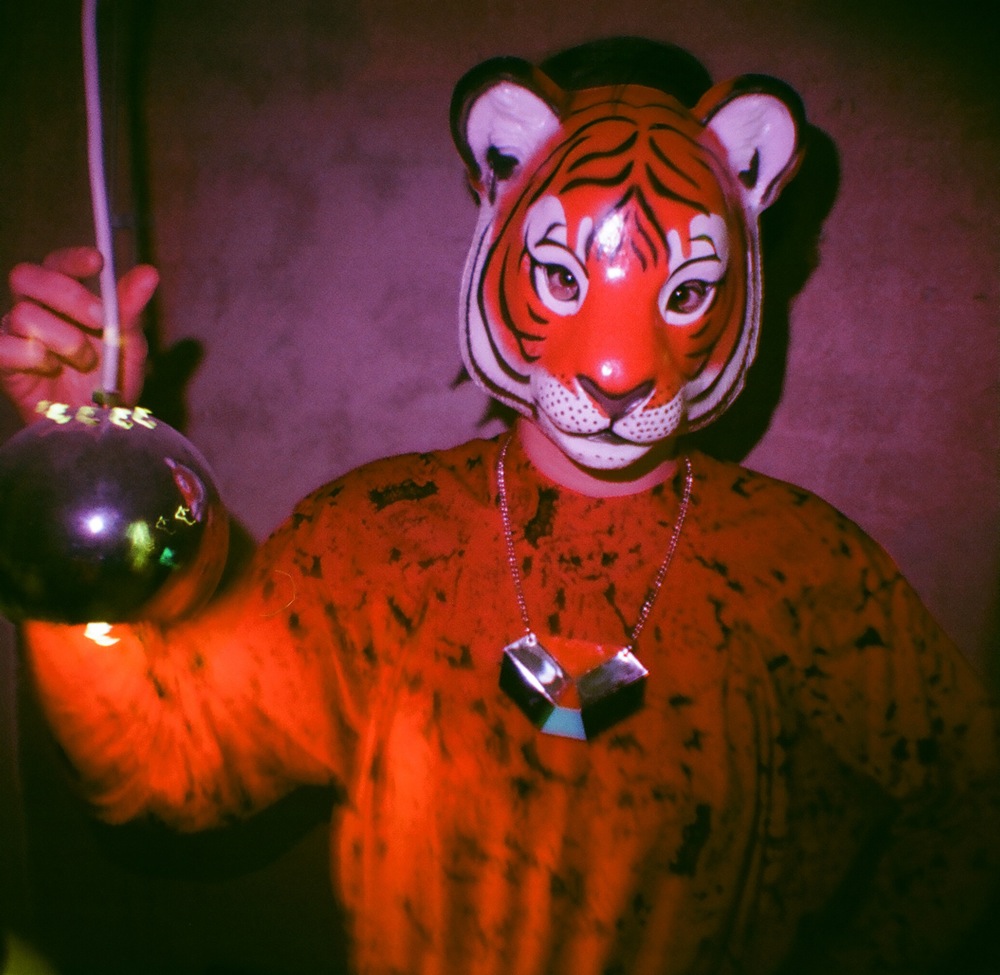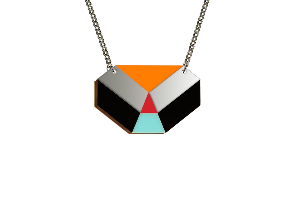 A M/L size lasercut plexiglass multipiece; mirror + black, blue, orange and red BABOON Talismanimal pendant on a silver coloured metal chain.