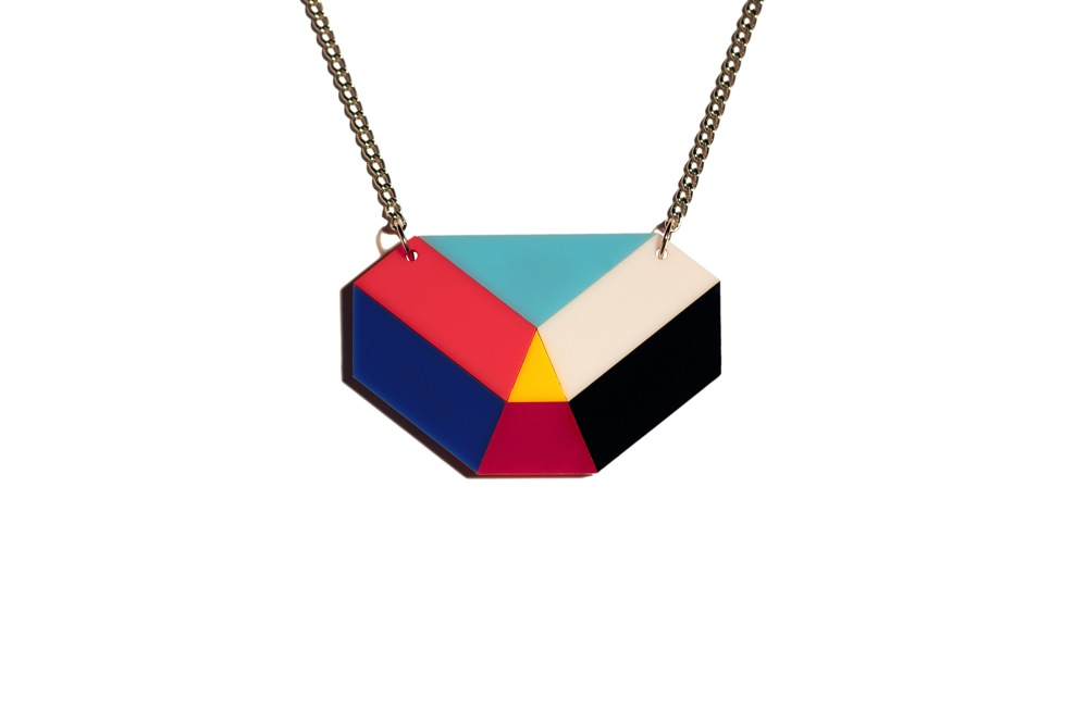 A M/L size lasercut multicolour plexiglass pendant on a silver coloured metal chain.