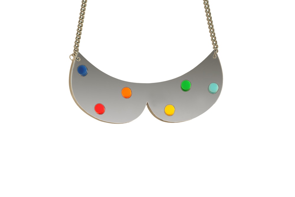 A M/L size lasercut multicolour dots on mirror plexiglass CANDY COLLAR pendant on a silver coloured metal chain.