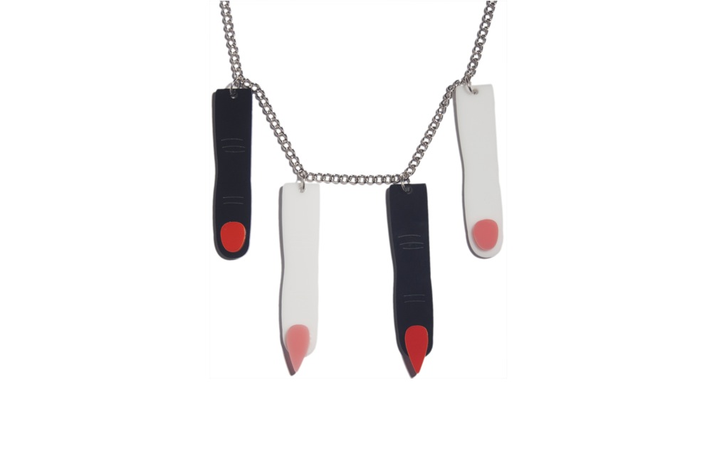 A L size lasercut plexiglass black and white FINGERS and red nails pendants on a silver coloured metal chain.