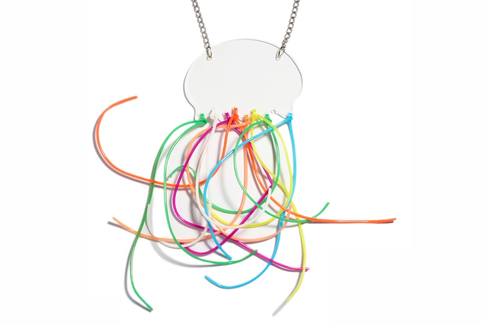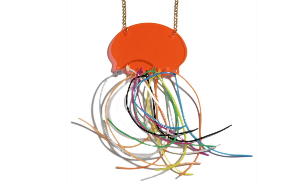 This listing is for a L size laser cut plexiglass MEDUSA pendant with various color straps on a silver coloured metal chain . Available in transparent NEON orange plexiglass, transparent TRANSPARENT and PINK.